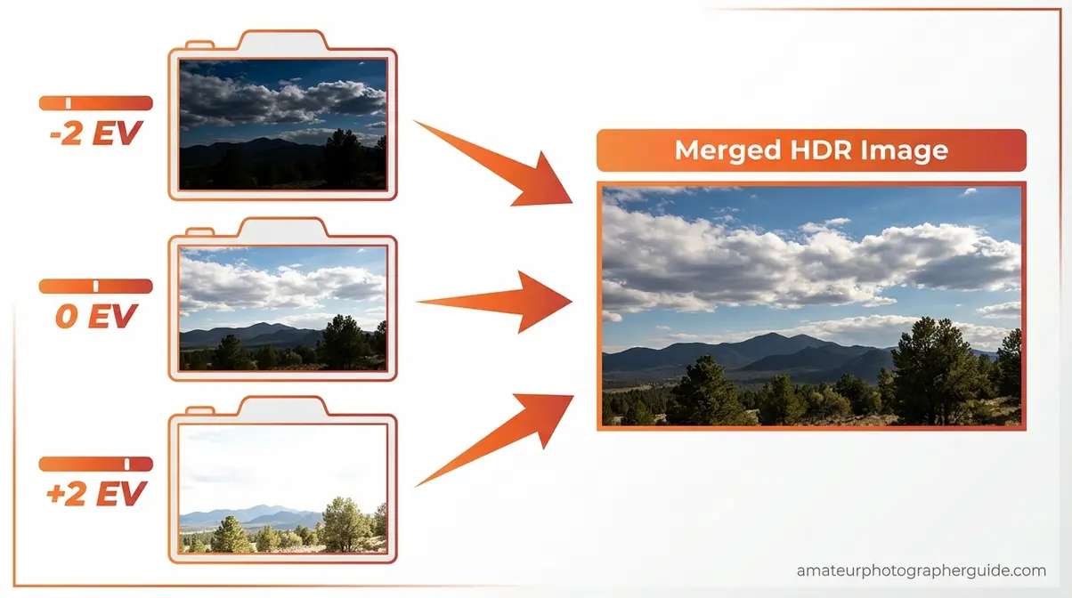 Exposure bracketing is the capture method behind HDR — shooting the same scene multiple times at different exposure values so you have both a well-exposed highlight frame and a well-exposed shadow frame to merge.